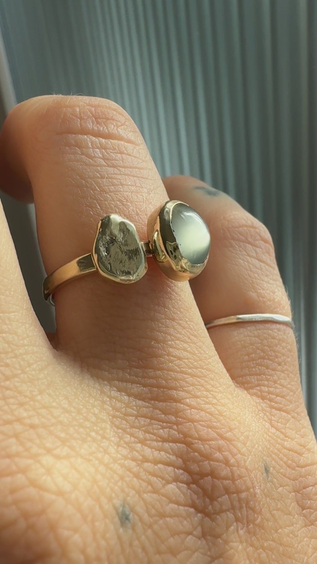 This is a one-of-a-kind ring made with a rare green moonstone cabochon set in 14k chunky gold band. We love this soft, earthy green of this stone with its pop of iridescent. Green Moonstone is a more rare form of the more common blue moonstone, and is known to be highly connected to the mystical and magical. The color feels very calming. The pebble is made of solid recycled studio scraps in 14k gold.