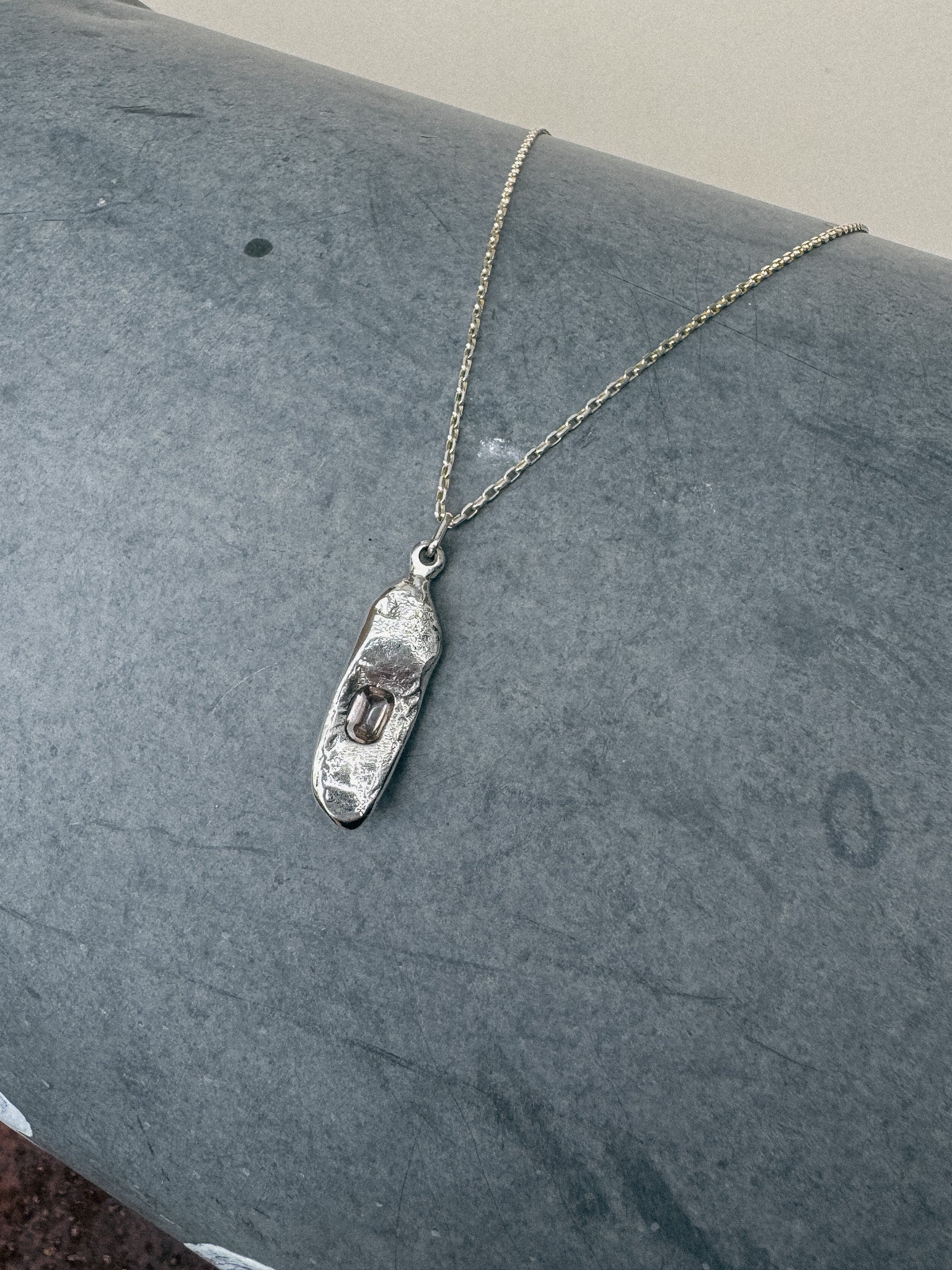 Cast in sterling silver and features embedded sapphire crystals. Worn close to the heart, they carry the sense of discovery, something raw, elemental, and enduring.