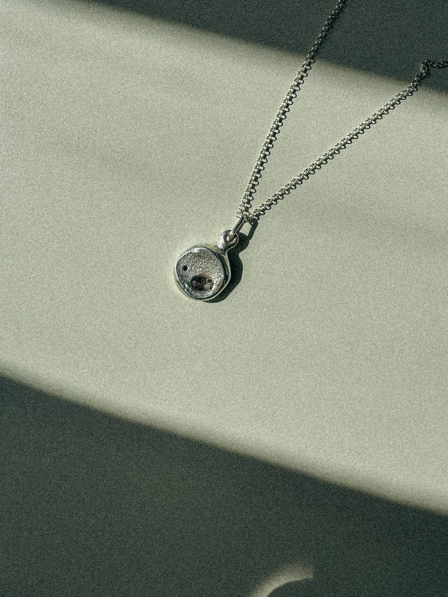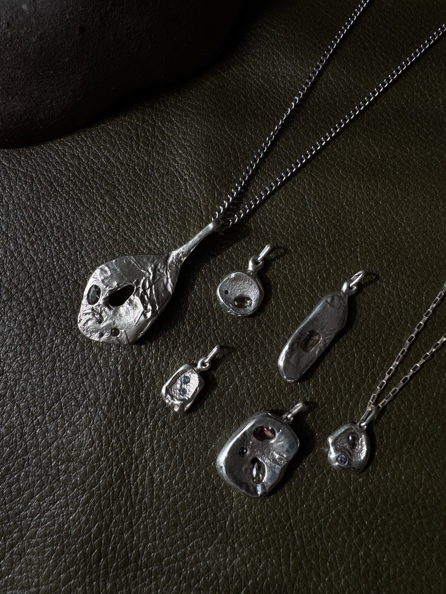 Cast in sterling silver and features embedded sapphire crystals. Worn close to the heart, they carry the sense of discovery, something raw, elemental, and enduring.
